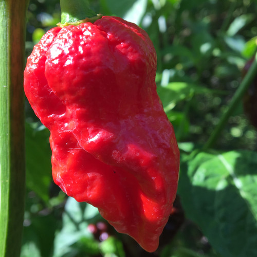 The Red Naglah was created by crossing the original 7 Pot Douglah and the Red Ghost (Bhut Jolokia) pepper. The Red Naglah is similar in size to the Red 7 Pot Douglah pepper but some pods look more like stubbier Ghost peppers. The Red Naglah has a fruity flavor and less heat compared to the original 7 Pot Douglah. Most people that have tried both the red and chocolate versions of the Naglah prefer the flavor profile of the Red 7 Pot Douglah. The Red Naglah averages about 1,000,000 to 1,265,000 Scoville Heat Units.